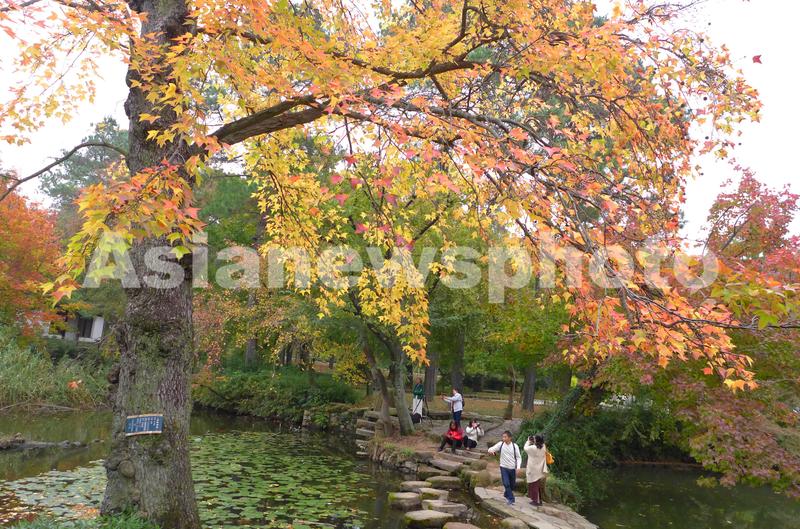 11月23日,几名游客在满目红枫掩映下的苏州天平山景区游玩拍照。