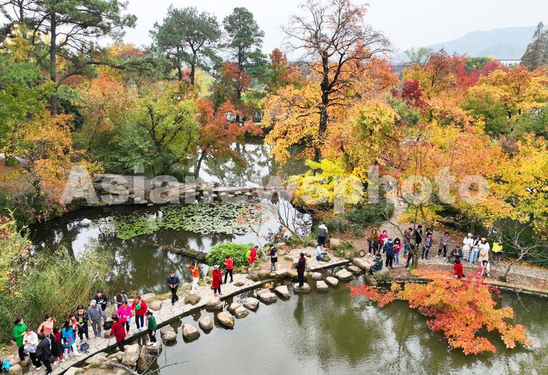 11月23日,游人在枫叶绯红的苏州天平山景区游览(无人机照片)。