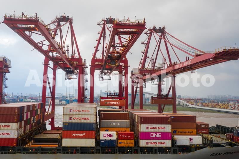 图片说明:2022年11月23日,浙江省宁波北仑第一集装箱码头,美西线的“圣朗科桥”轮(SAN FRANCISCO BRIDGE)正在进行1628自然箱的吊装作业,完成作业后将前往美国塔科马港。