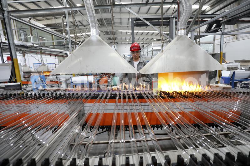 11月22日,在湖南省资兴经济开发区的旗滨医药材料科技有限公司,工人在中性硼硅药用玻璃素管生产线上作业。