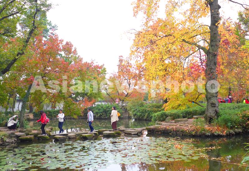 11月23日,几名游客在满目红枫掩映下的苏州天平山景区赏景游览。