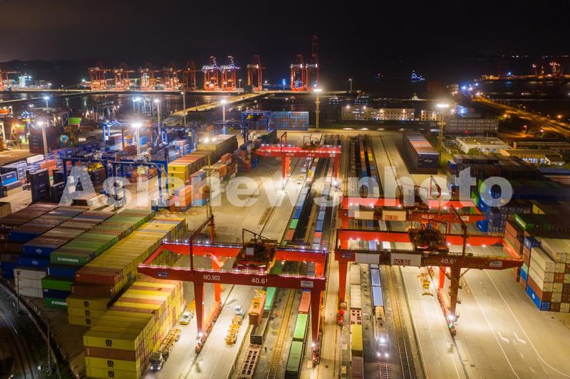 图片说明:11月23日,浙江省宁波舟山港铁路北仑港站,一列装载着太阳能配件的上饶班列正在忙碌地进行82个标准箱的吊装作业。