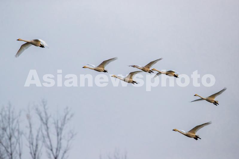 图片说明:2022年11月24日,一群大天鹅在沂河山东省临沂市郯城县马头段上空飞舞。