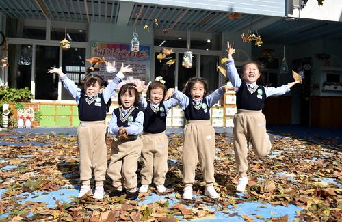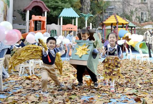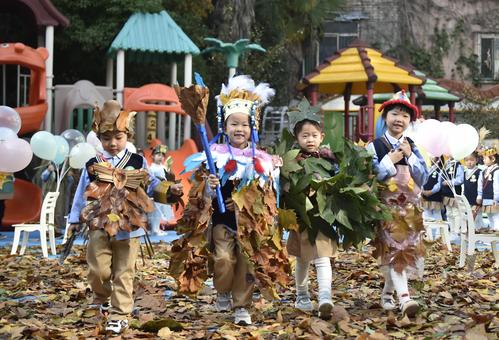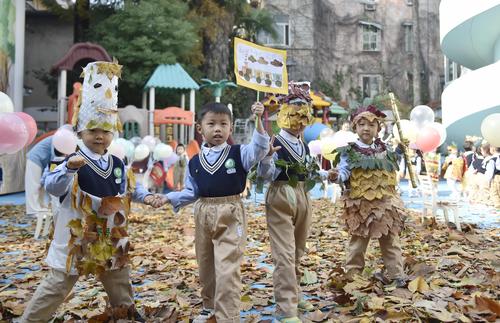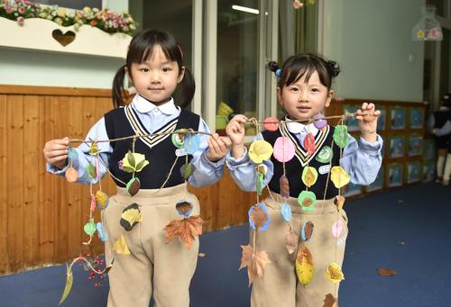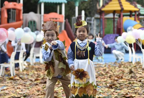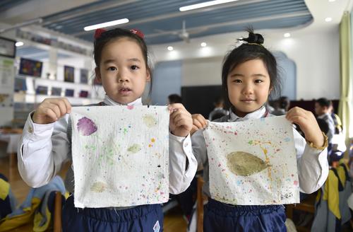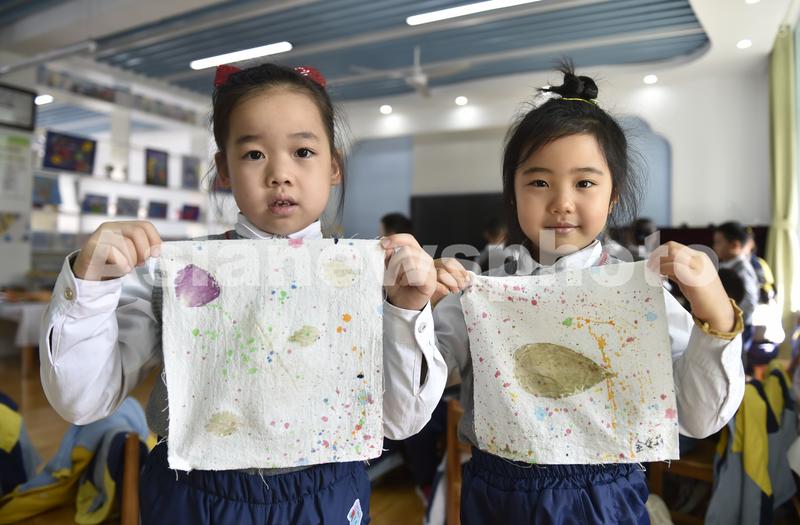 图片说明:2022年11月25日,在安徽省合肥市安庆路幼儿园教育集团总园,小朋友展示落叶手工植物拓印作品。
