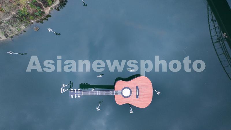 2022年11月20日,贵州省遵义市正安县城,一把吉他雕塑横卧在河面上,从空中俯瞰,吉他雕塑与周边的环境相映成趣,自成一景。