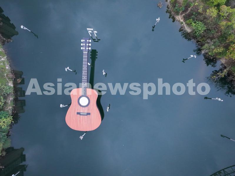 2022年11月20日,贵州省遵义市正安县城,一把吉他雕塑横卧在河面上,从空中俯瞰,吉他雕塑与周边的环境相映成趣,自成一景。