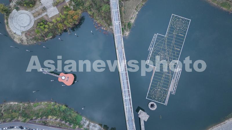 2022年11月20日,贵州省遵义市正安县城,一把吉他雕塑横卧在河面上,从空中俯瞰,吉他雕塑与周边的环境相映成趣,自成一景。