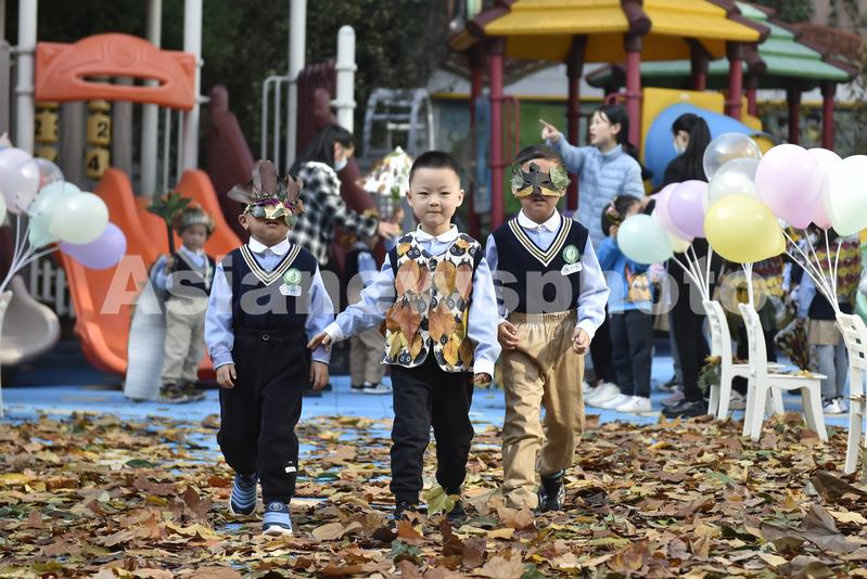 图片说明:2022年11月25日,在安徽省合肥市安庆路幼儿园教育集团总园,小朋友身着用不同树叶装饰的“时装”走秀。