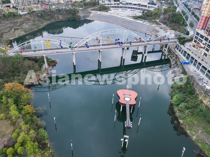 2022年11月20日,贵州省遵义市正安县城,一把吉他雕塑横卧在河面上,从空中俯瞰,吉他雕塑与周边的环境相映成趣,自成一景。