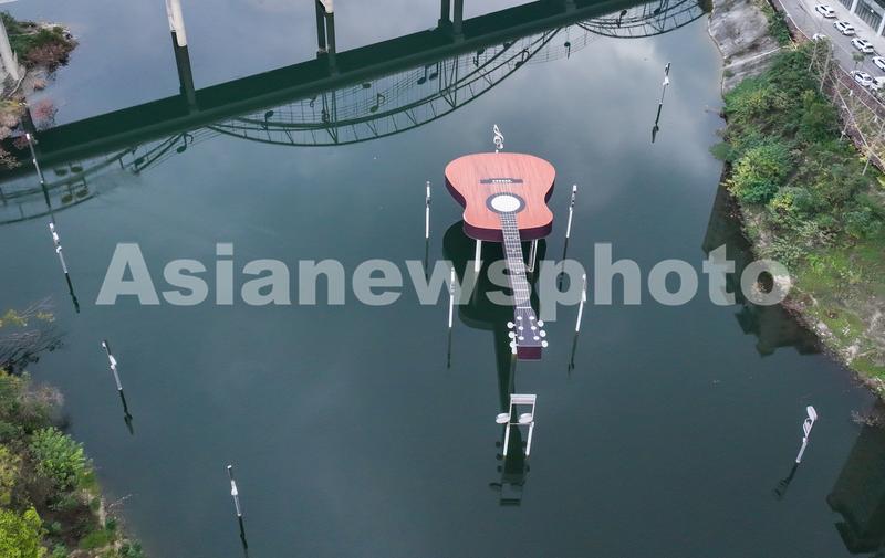 2022年11月20日,贵州省遵义市正安县城,一把吉他雕塑横卧在河面上,从空中俯瞰,吉他雕塑与周边的环境相映成趣,自成一景。