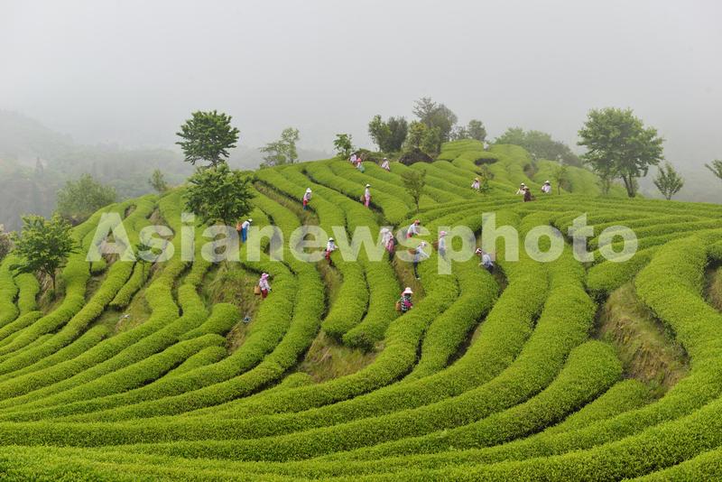 2022年4月14日,福建省建瓯市,地处武夷山脉全国重点茶叶产区的一处茶园,茶农开采春茶。