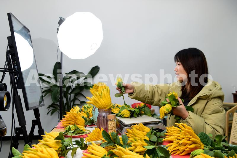 2022年11月30日,浙江省金华市金东区赤松镇北山口村的文旅会客厅直播间里或佛手种植大户大棚内,网络主播正在直播带货,让佛手搭上互联网的快车,村民们靠“金佛手”走上致富路。