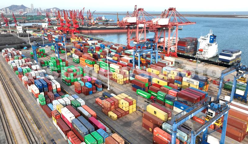 2022年12月1日,位于新亚欧大陆桥东端起点处的连云港港集装箱码头一片繁忙景象(无人机照片)。