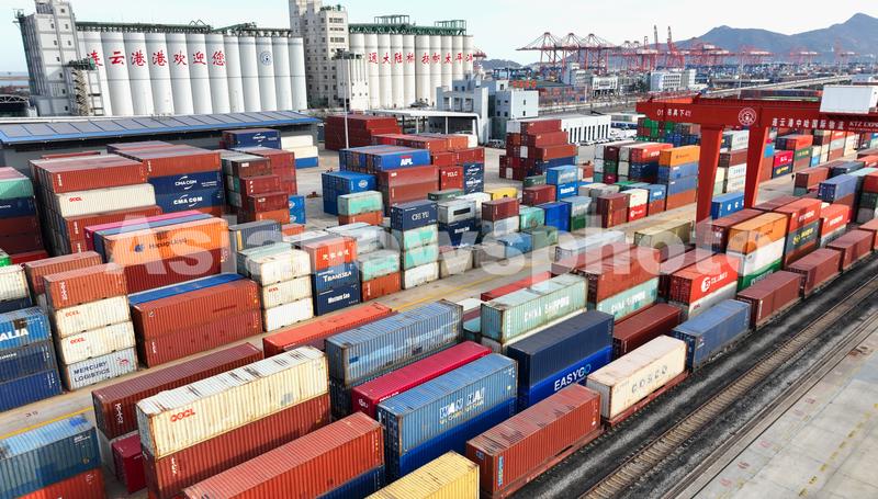 2022年12月1日,位于新亚欧大陆桥东端起点处的中哈连云港物流合作基地一片繁忙景象(无人机照片)。