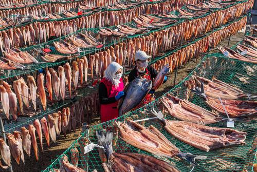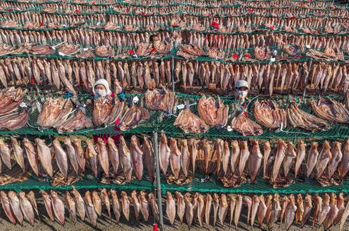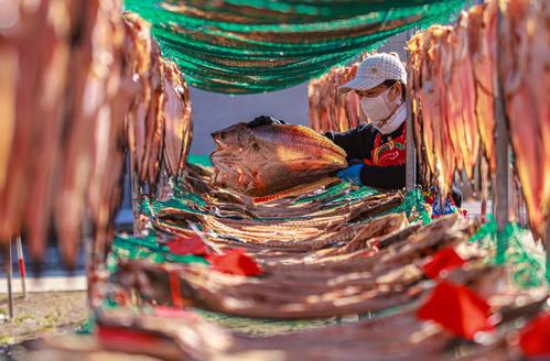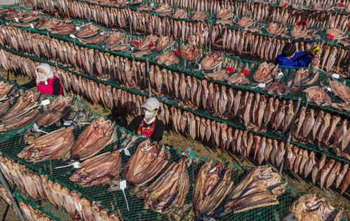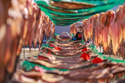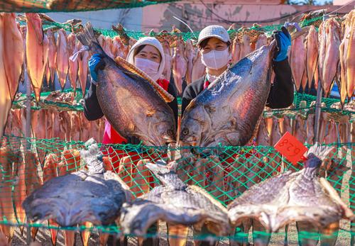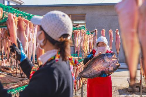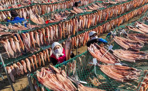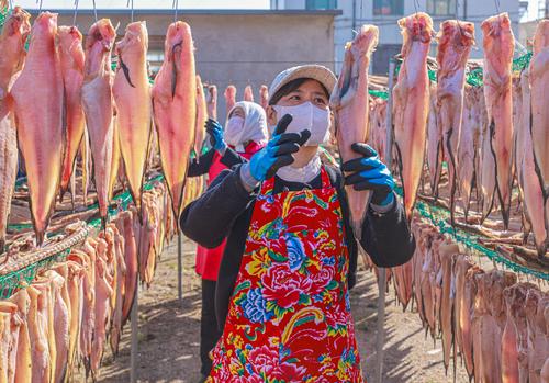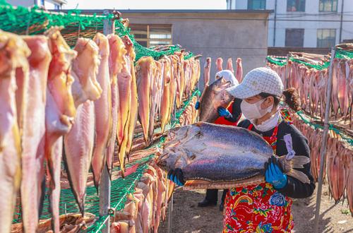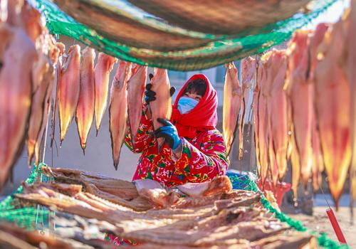 入冬之后,晾晒鱼干是胶东半岛渔家的传统习俗。2022年12月2日,在山东省荣成市石岛管理区王连街道北桥头村一处渔家小院,农户们抓紧时间晾晒鱼干,供应市场。荣成渔家利用传统工艺制作的“回水鱼干”有上千年历史,被列为省级非物质文化遗产名录。当地人用海水将鱼冲洗干净,挂在架子上晾晒,具有浓郁的地方特色和海洋风味。经过特殊的腌、晾、冲洗、捂制等环节,晒出的鱼干咸香美味,供不应求。近年来,当地渔民通过网络直播、带货、开网店等渠道,将特色鱼干产品远销各地,为渔民增收提供更多途径。