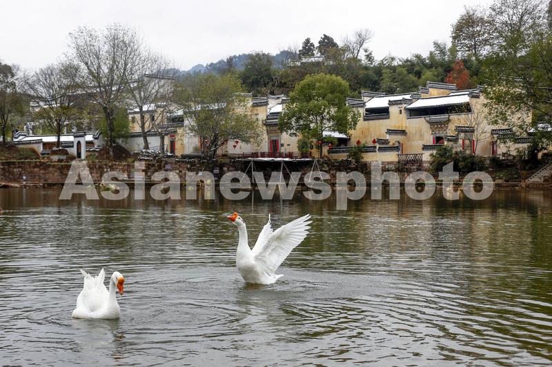 2022年12月2日,安徽省黄山市徽州区呈坎古村雪后景美如画。 近日,安徽省黄山市徽州区呈坎古村落迎来入冬首场降雪,皑皑白雪落在粉墙黛瓦的徽派古民居上,成群的白鹅点缀其中,如诗如画。