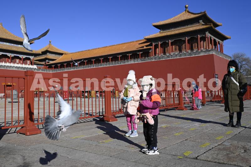 图片说明:小游客在午门前投喂广场鸽。