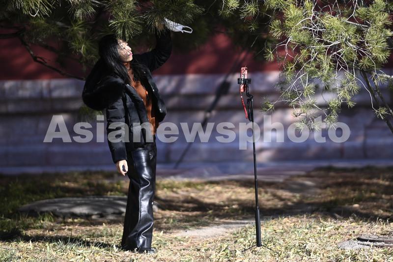 图片说明:市民在故宫博物院外进行网络直播。