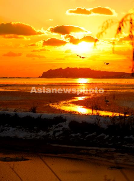 2022年12月5日清晨,山东荣成天鹅湖,大天鹅在灿烂的朝霞下飞舞。