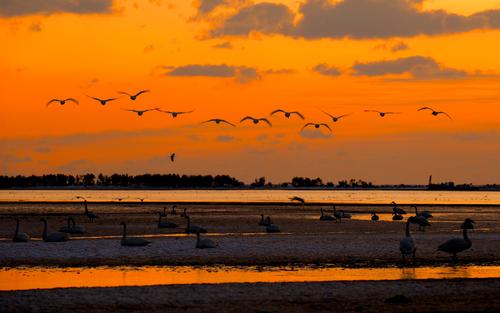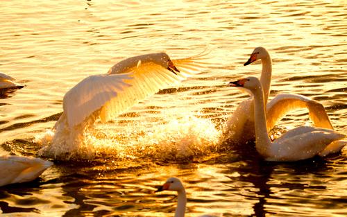 2022年12月5日清晨,山东荣成天鹅湖,大天鹅在灿烂的朝霞下飞舞。 冬日里,来自西伯利亚等地到山东荣成大天鹅自然保护区越冬栖息的大天鹅迎着朝霞飞舞、嬉戏,给滨海小城增添了靓丽的风景。