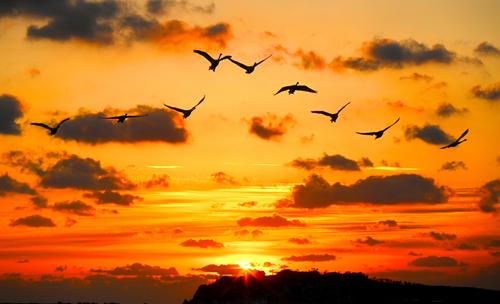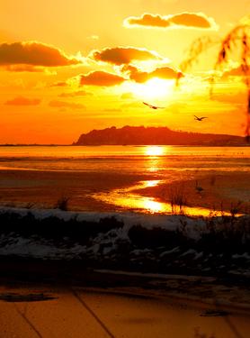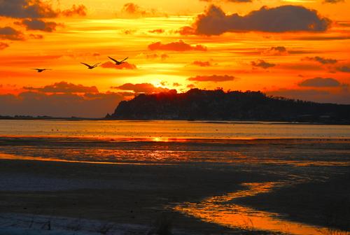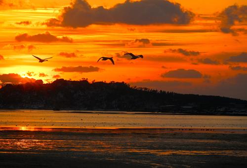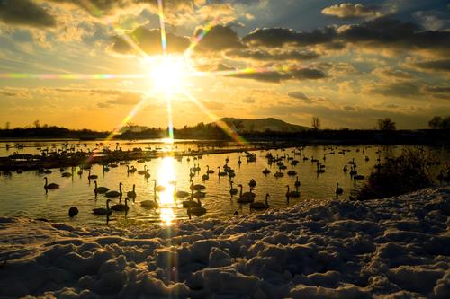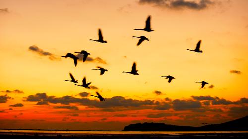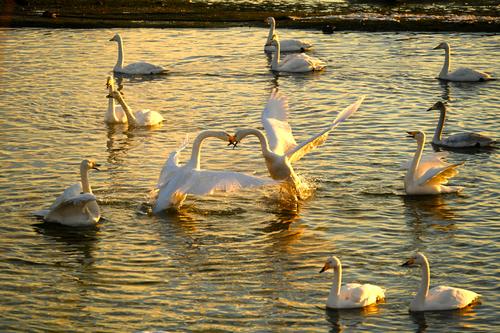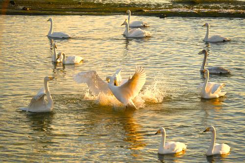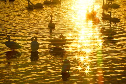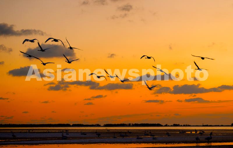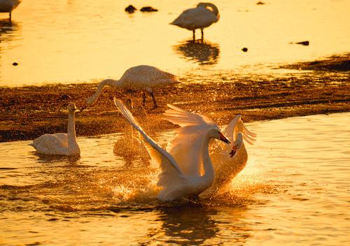2022年12月5日清晨,山东荣成天鹅湖,大天鹅在灿烂的朝霞下飞舞。