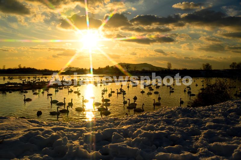 2022年12月5日清晨,山东荣成天鹅湖,大天鹅在灿烂的朝霞下飞舞。