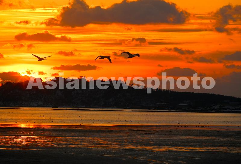 2022年12月5日清晨,山东荣成天鹅湖,大天鹅在灿烂的朝霞下飞舞。