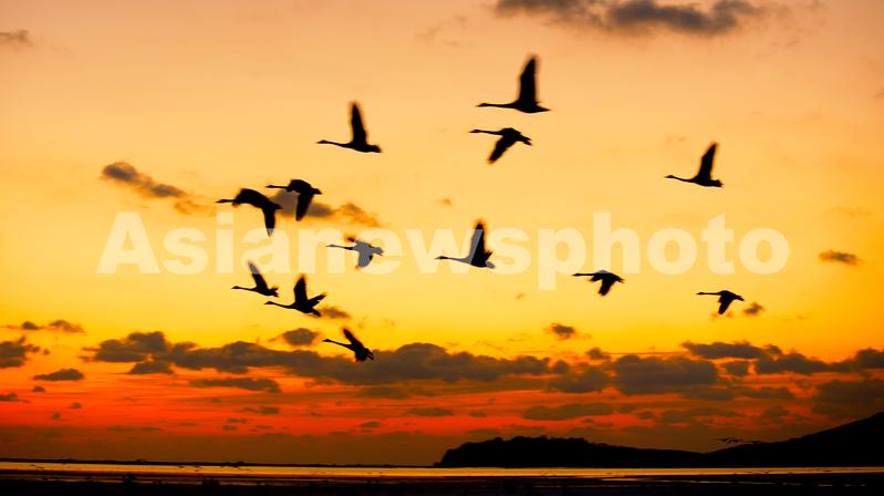 2022年12月5日清晨,山东荣成天鹅湖,大天鹅在灿烂的朝霞下飞舞。