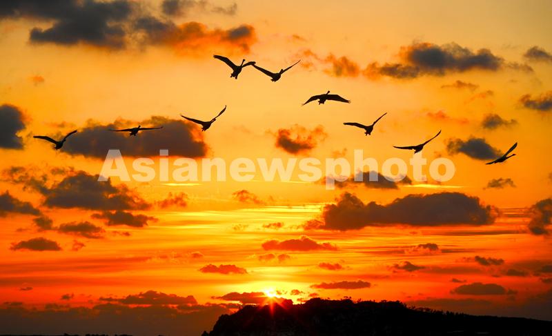 2022年12月5日清晨,山东荣成天鹅湖,大天鹅在灿烂的朝霞下飞舞。