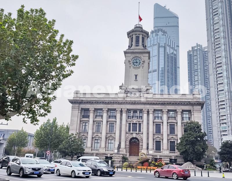 图片说明:12月6日,湖北省武汉市有着百年历史的武汉关,降下国旗沉痛悼念敬爱的江泽民同志。