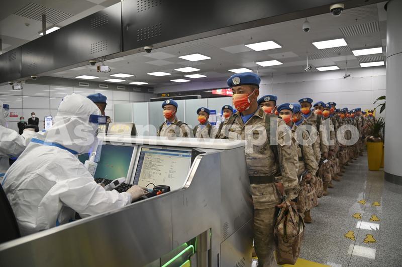 图片说明:2022年12月6日晚,中国第9批赴南苏丹(朱巴)维和步兵营第一批次官兵办理通关手续,准备出征。