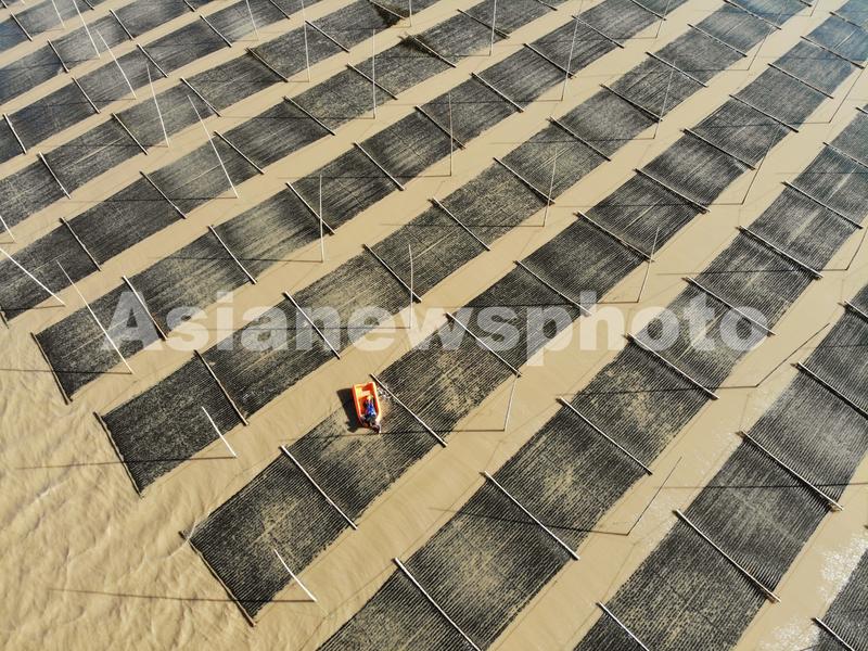 2022年12月6日,浙江省台州市路桥区金清镇海边紫菜养殖区,养殖户在丰收紫菜。