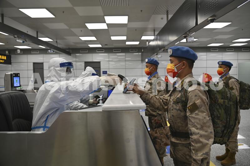 图片说明:2022年12月6日晚,中国第9批赴南苏丹(朱巴)维和步兵营第一批次官兵办理通关手续,准备出征。
