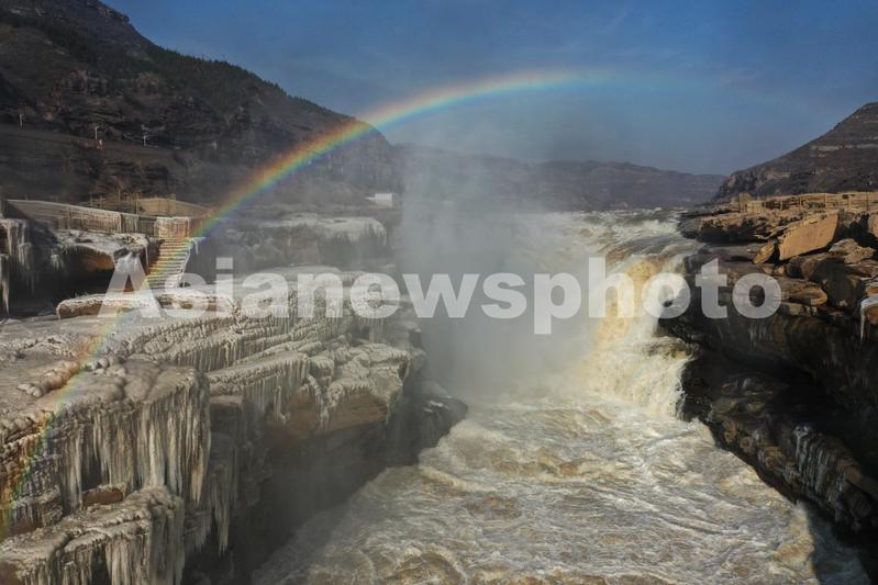 2022年12月7日,在山西吉县黄河壶口瀑布拍摄的冰挂彩虹景观。大雪时节,受持续降温天气影响,位于山西吉县和陕西宜川县交界的黄河壶口瀑布出现冰挂景观,层层叠叠的冰挂与瀑布上空飞舞的彩虹交相辉映,景色壮美。