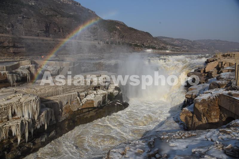2022年12月7日,在山西吉县黄河壶口瀑布拍摄的冰挂彩虹景观。大雪时节,受持续降温天气影响,位于山西吉县和陕西宜川县交界的黄河壶口瀑布出现冰挂景观,层层叠叠的冰挂与瀑布上空飞舞的彩虹交相辉映,景色壮美。
