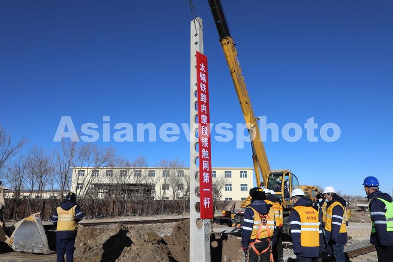 图片说明:2022年12月8日,中铁电气化局建设者在内蒙古锡林郭勒盟境内太子城至锡林浩特项目施工现场进行接触网第一杆组立工作。