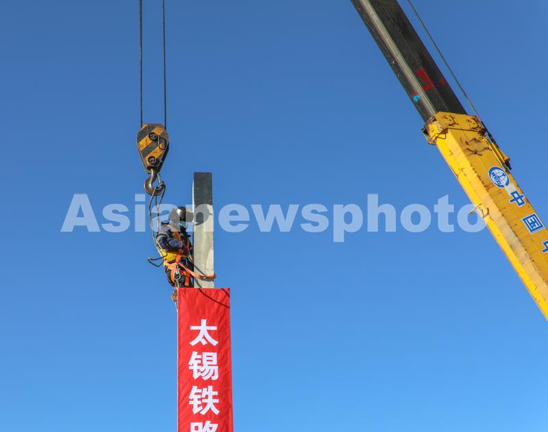 图片说明:2022年12月8日,中铁电气化局建设者在内蒙古锡林郭勒盟境内太子城至锡林浩特项目施工现场进行接触网第一杆组立工作。