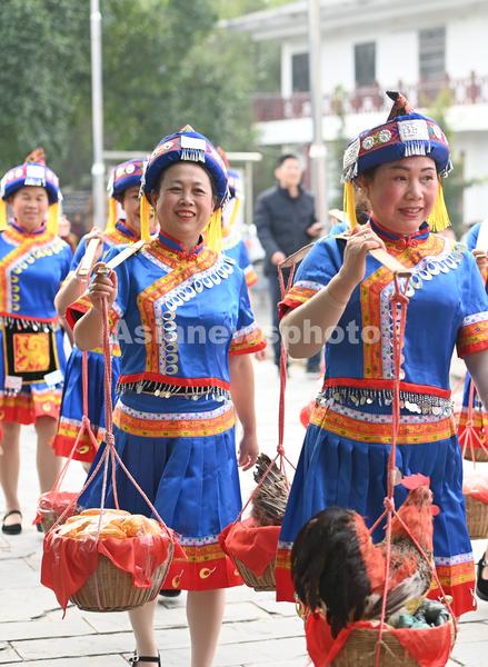 图片说明:12月10日,在广西河池市罗城仫佬族自治县东门镇石围古村,村民们正在展演仫佬族传统婚俗。