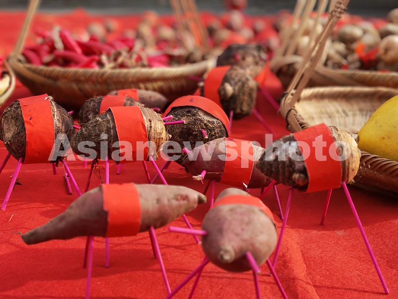 图片说明:12月10日,在广西河池市罗城仫佬族自治县东门镇石围古村拍摄到红薯、芋头做的“猪”、“牛”,等待道公施“法术”。