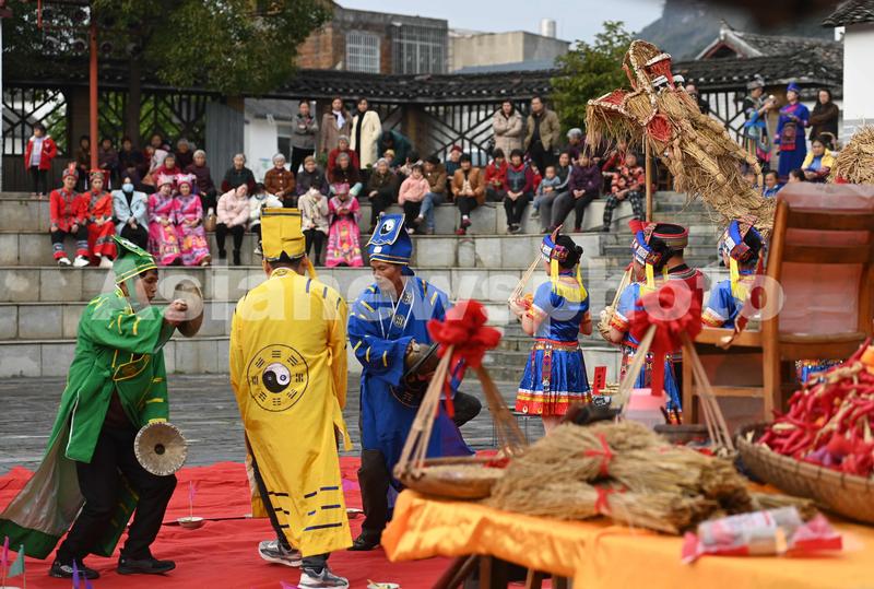 图片说明:12月10日,在广西河池市罗城仫佬族自治县东门镇石围古村,喜乐愿祈福活动现场。