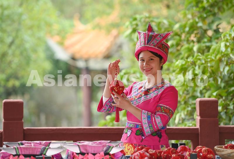 图片说明:12月10日,在广西河池市罗城仫佬族自治县东门镇石围古村,一位姑娘正在展示仫佬族绣球。