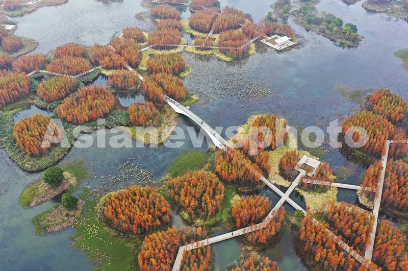 2022年12月11日,江西省南昌高新区鱼尾洲湿地公园池杉进入最佳观赏期,成片池杉树叶由绿转红,色彩斑斓,景美如画,吸引不少市民前来参观游玩。