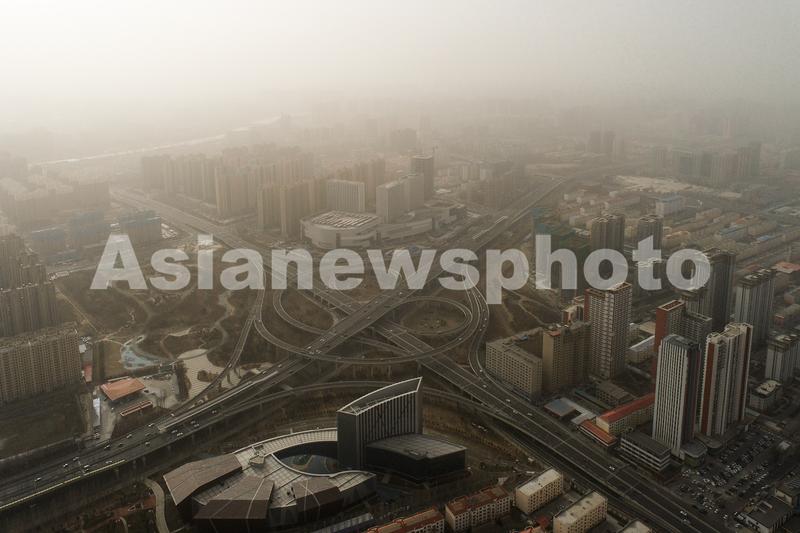 2022年12月12日,沙尘笼罩在呼和浩特街头上空(无人机照片)。