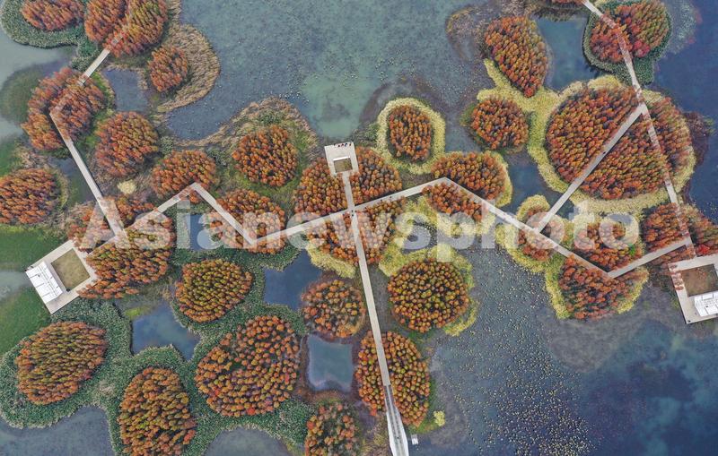 2022年12月11日,江西省南昌高新区鱼尾洲湿地公园池杉进入最佳观赏期,成片池杉树叶由绿转红,色彩斑斓,景美如画,吸引不少市民前来参观游玩。