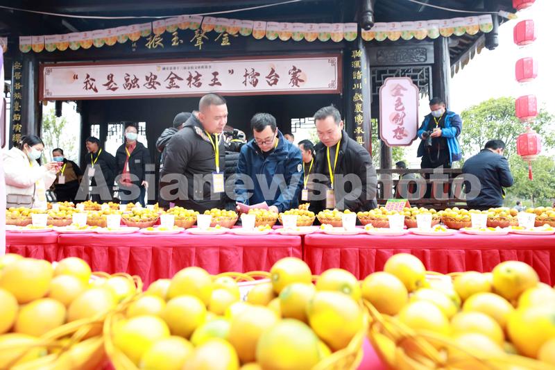 图片说明:12月9日,在广西柳州市融安县举办的第十三届金桔文化旅游节“我是融安金桔王”擂台赛上,专业评委对参赛金桔进行打分。