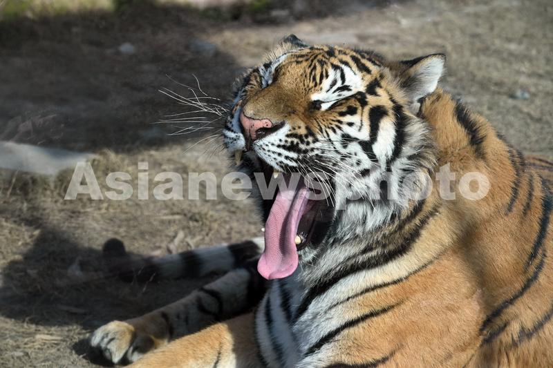 12月12日,河南省沁阳市和生森林动物乐园大型猫科动物散养区,一只打哈欠的东北虎。