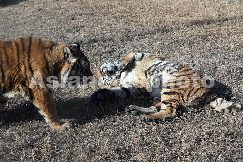 12月12日,河南省沁阳市和生森林动物乐园大型猫科动物散养区,两只东北虎在草地上嬉戏。