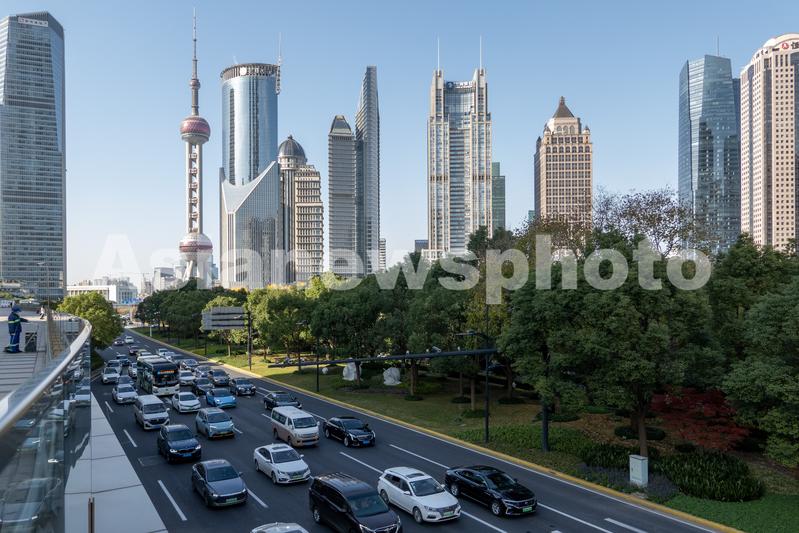 2022年12月14日,上海,陆家嘴世纪大道上车流繁忙,东方明珠等超高层地标建筑构成的城市天际线蔚为壮观,摩登都市风景独好。