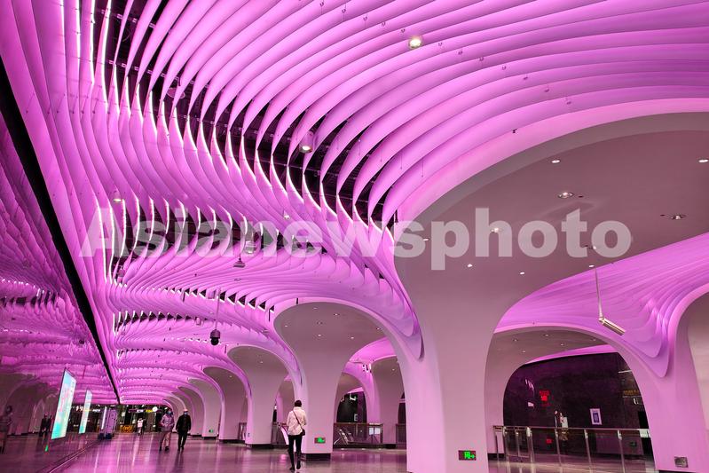 2022年12月14日,上海,地铁14号线豫园站的室内采用了大量弧线设计,动态的吊顶空间配合色彩变幻的灯光,营造出美轮美奂室内环境,地铁站仿佛变身艺术宫殿,14号线豫园站因此也被网友称为上海“最美地铁站”。
