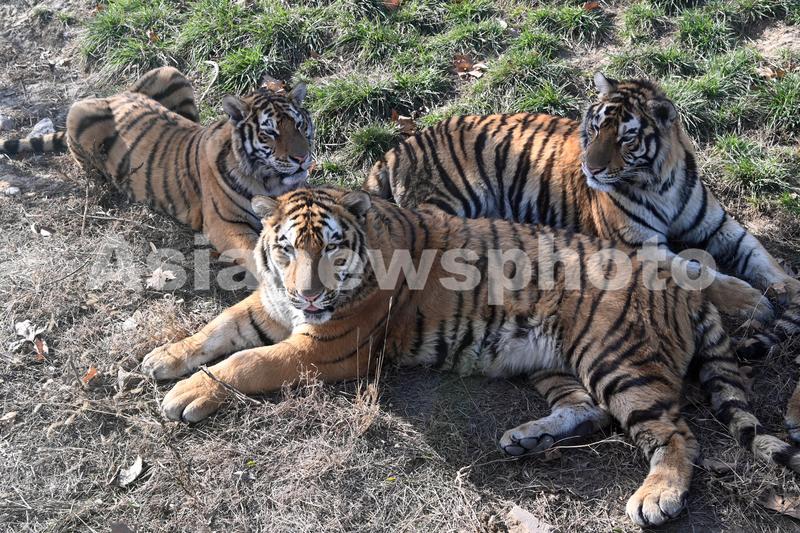 12月12日,河南省沁阳市和生森林动物乐园大型猫科动物散养区,几只东北虎悠闲地卧在草地上。
